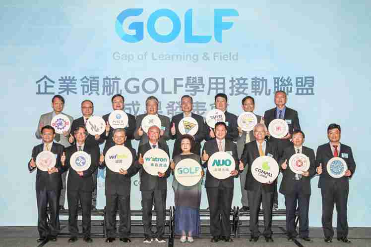 GOLF学用接轨联盟集结企业和学校的力量,,,打造「学用合一、、产学接轨」的创新合作平台 (前排左起:淡江大学副校长何启东、、、元智大学校长林启瑞、、纬育执行长许延岳、、、纬创总经理暨执行长黄柏漙、、、、教育部政务次长范巽绿、、、、开云电子董事长暨执行长彭双浪、、、、仁宝总经理暨执行长翁宗斌、、大同大学校长何明果、、、、圣约翰科大校长艾和昌;后排左起:明新科大校长林启瑞、、、龙华科大校长葛自祥、、、、台湾科大校长廖庆荣、、、、中兴大学副校长郑政峯、、、中央大学校长周景扬、、台北科大副校长任贻均、、中华科大副校长石大明、、明志科大校长刘祖华)