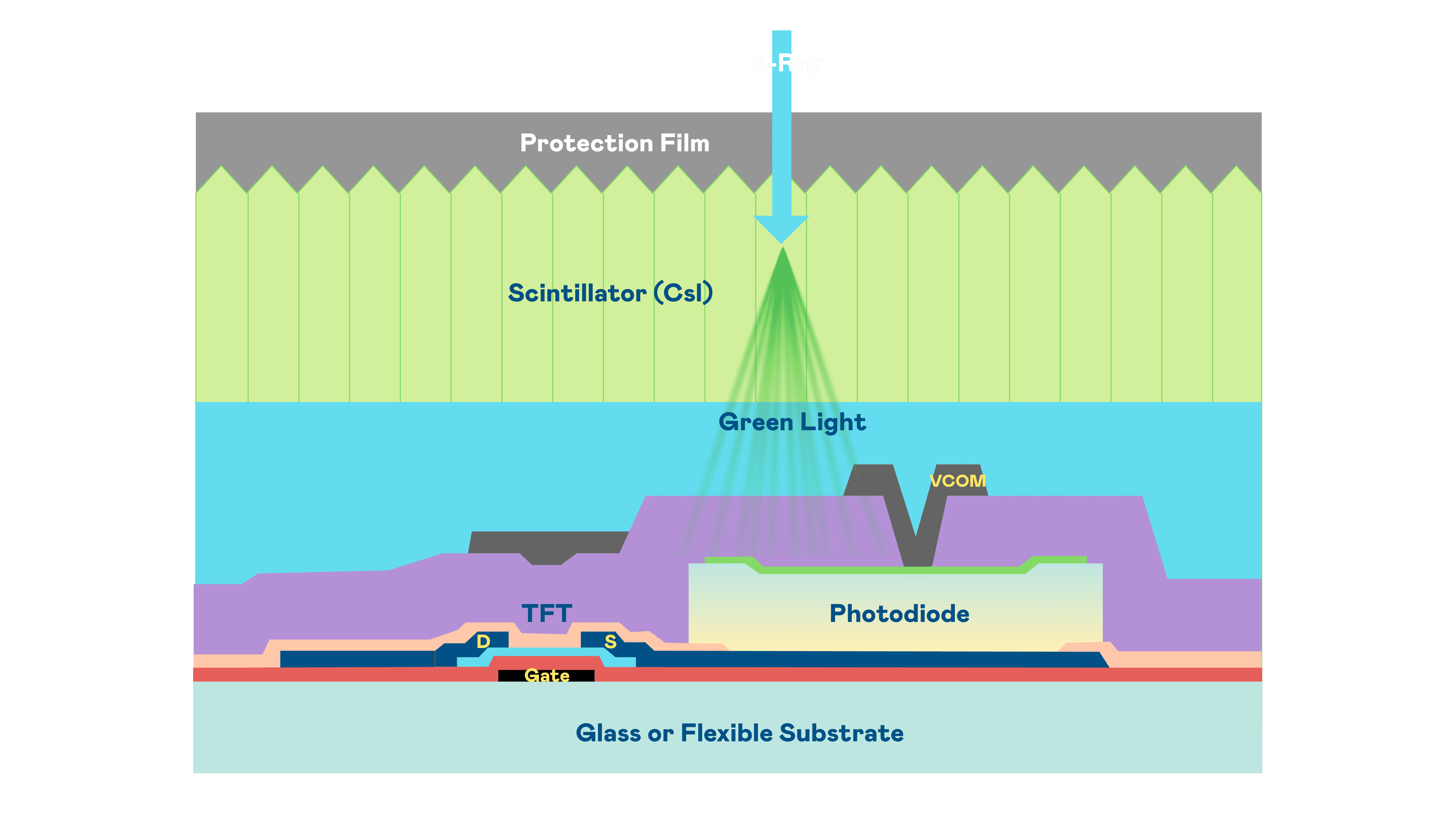开云电子的X光影像感测阵列使用薄膜电晶体 (TFT) 作为每个像素的读取开关,,,,搭配光电二极体(Photodiode)的光电转换元件,,用以感测X光影像讯号。。